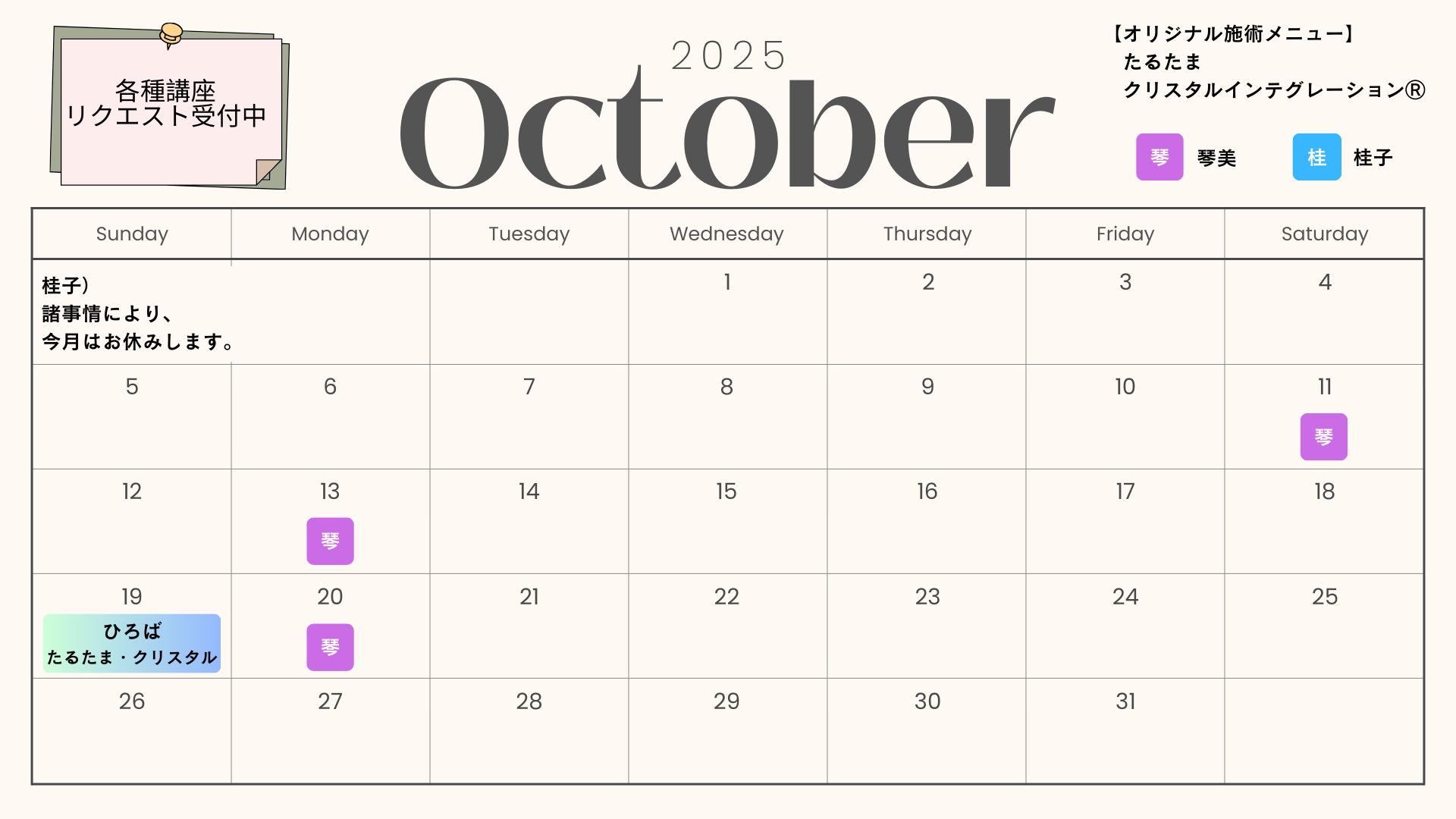 | ■持ち物 | 【たるたま施術】 ・動きやすい服装 ・タオル ・飲み物 【クリスタルインテグレーションⓇ】 ・動きやすい服装 |
